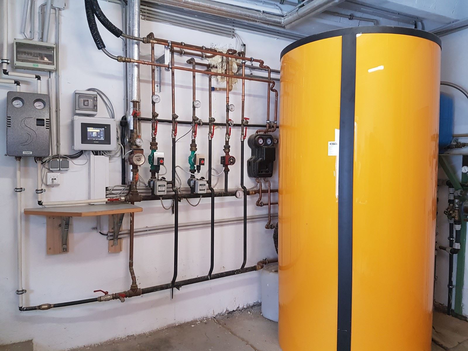 50 m Fernwärmeleitung, 1.650 l Pufferspeicher, 500 l Warmwasserspeicher, 16 qm Solaranlage, 3 geregelte Heizkreise, 3 ungeregelte Heizkreise (Boiler, Werkstatt, Poolwasser)
